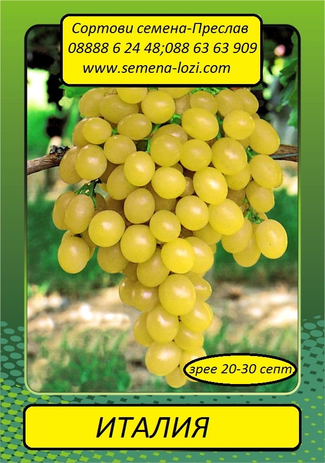 ИТАЛИЯ- СРЕДНОКЪСЕН СОРТ С ЕДРИ ОБЛИ КЕХЛИБАРЕНО-ЖЪЛТИ ЗЪРНА С МИРИЗМА НА ХАМБУРГСКИ МИСКЕТ. ЗРЕЕ ОТ КРАЯ НА СЕПТЕМВРИ ДО 15 ОКТОМВРИ