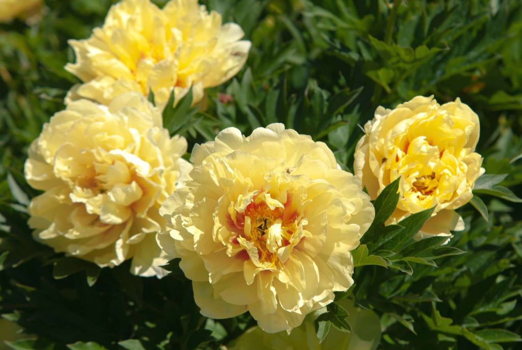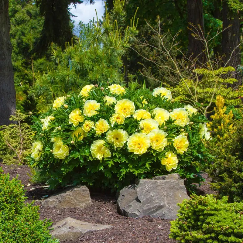 Ярко жълт божур дървовиден и храстовиден с над 50 броя цвята - Paeonia Itoh Bartzella
