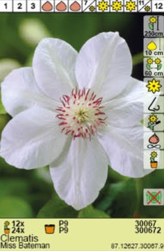 Сортът се характеризира с ослепително бели цветове с бледозелена ивица и контрастни червени тичинки. Клематисът Miss Bateman цъфти от май до юни.