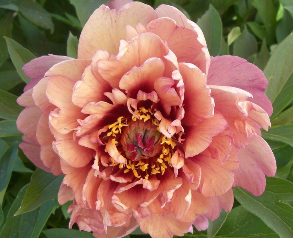 Този очарователен сорт ще оформи изправена туфа с лъскави зелени листа. Цветове са много едри, полукичести и цъфтят първоначално в розово, което постепенно преминава в кремаво, но червеникавите отенъци няма да изчезнат напълно, а центърът му е в