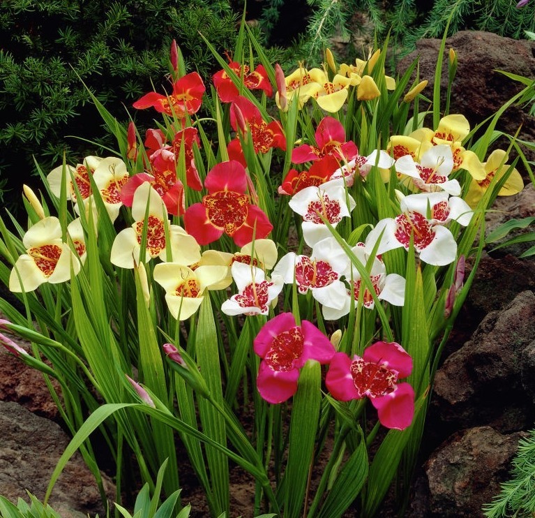 Тигридията е едно от най-красивите градински цветя, което се отличава с изключително пъстри цветове, познато е още като Мексиканска мида или Тигрово цвете. Сортът, който се отглежда на открито в градината е павония.